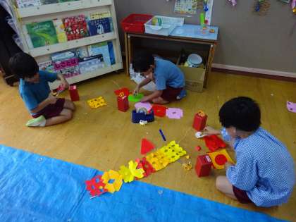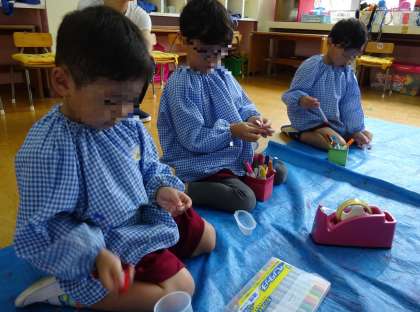今日は、まつ組・ばら組で一緒に七夕飾りをつくって遊びました。お家から持ってきていただいたプリンカップやゼリーカップを大変身!!素敵な七夕飾りができましたよ。