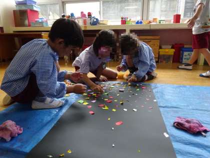 また、折り紙を使って切り紙もしましたよ。どんどん長くつなげ、自分の身長よりも長くつなげることができ、大喜びでした。切り紙の切れ端を集めて、天の川に!七夕の日が楽しみですね。