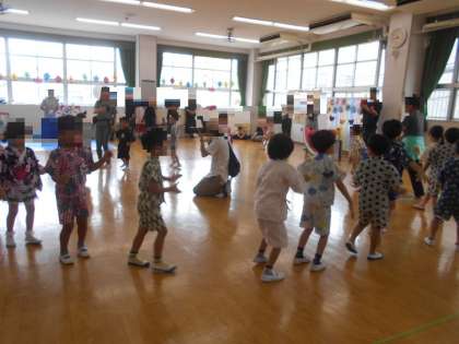 みんなで円になって「アンパンマン音頭」をしました。子ども達が躍った後、お家の人と一緒に盆踊りをしました。みんなで大きな円がつくれて、大喜びでした。