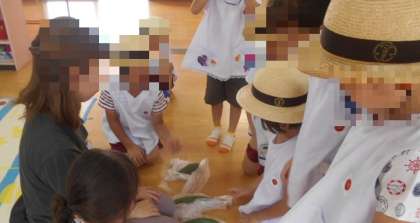幼稚園では、たくさんの夏野菜を育てています。今日は、きゅうり、枝豆、ミニトマト、ピーマン、インゲン豆、ゴーヤ、オクラをみんなで分けました。「野菜やさんだよー」と声をかけると「今日は、どれにしようかな?」と、考えていましたよ。お家でどんな料理にして食べたのか、また聞かせてくださいね!