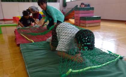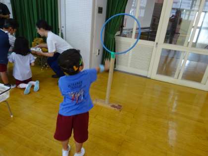 遊戯室で、いろいろな忍者の修行をして遊びました。修行の名前も子どもたちと考えましたよ。ネットをもぐって進んでいく「もぐらの修行」、ゴム跳びの「バッタの修行」など、子どもたちは、忍者のイメージをもって遊んでいます。また、手裏剣がしたいとの話から、今日は、牛乳パックで手裏剣をつくって、的に入れていました。的を狙い、入った時には大喜びでした!これからも日々、忍者の修行は続きます。明日も楽しく遊びましょうね。