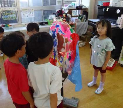 住吉大社の御田の稲を守るためにつくったかかしが完成しました!「ここにキバつけようかな」「羽はここにしよう」と、自分なりに考えていました。かかしの名前もみんなで考え、「うさぎおばけ」になりましたよ。「住吉大社の稲を守ってから、粉浜幼稚園も守ってね」と、つぶやく姿もありました。みんなで力を合わせてつくる楽しさも感じることができました!