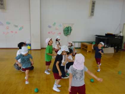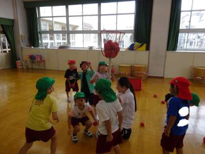 今日は、チームに分かれて玉入れをしました。かごに向かって一生懸命に玉を投げていましたよ。負けたチームはとても悔しい気持ちも経験し、どうしたら玉が入るのかを考える姿も見られました。勝った喜び、負けた悔しさなど、いろいろな気持ちを感じる経験も大切にしていきたいと思います。