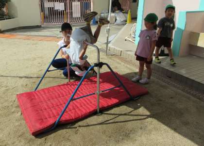 まつ組の子どもたちは、いろいろな体を動かす遊びに挑戦しています。「今日は、サッカーする」「一輪車で遠くまで行きたい」と毎日、自分で遊びを選んでいます。友達が鉄棒に挑戦していると「すごい!私もやってみたい!」と意欲をもって取り組んだり、「できるようになってきた!」「次は、もっと頑張ろう!」と友達同士で励ましあったりする姿が見られました。