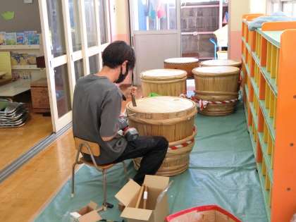 5歳児が演技で使う樽太鼓も、事業担当主事さんが整備しています。