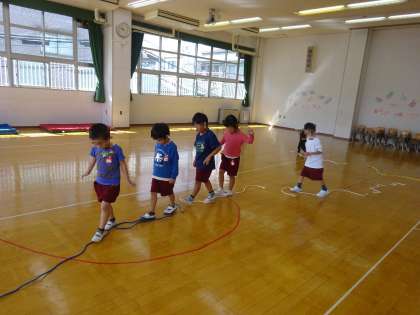 ばら組は運動会のプレゼントでカラー縄跳びをもらいました。今日は、縄を使って、いろいろな遊びをしましたよ。縄をもって体操をしたり、一本橋にして歩いたりしました。縄に親しみをもち、楽しめるようにしていきます。