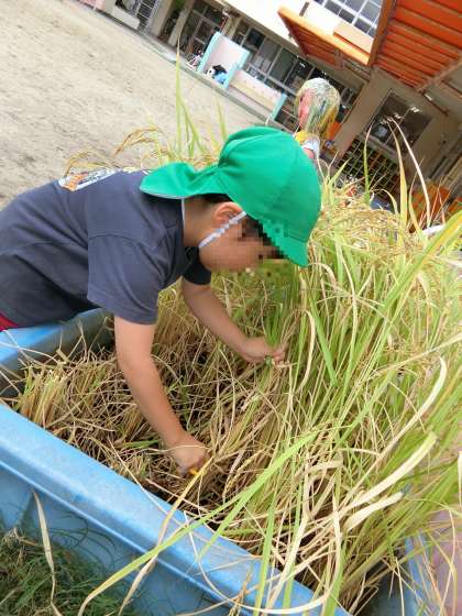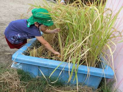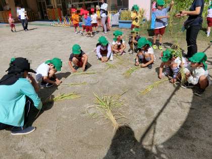 住吉かかしプロジェクトでいただいた稲の苗が生長しましたよ!みんなで稲刈りをしました。刈った稲を自分で束にして、天日干しをしましたよ。お米ができるまでについて知る良い機会になりました。