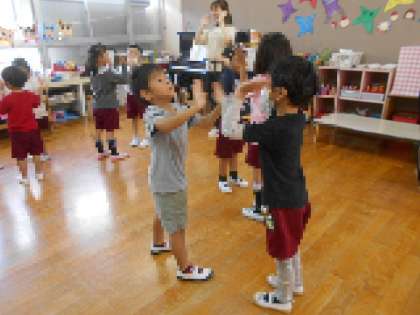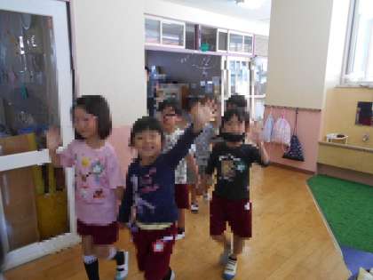 今日は、ばら組とまつ組で遠足ごっこをし、
