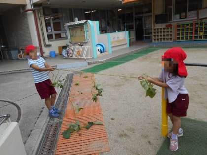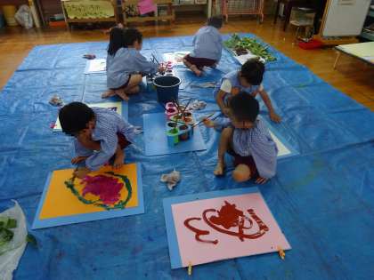 いもほりを存分に楽しんだ子どもたち。今日は、絵の具で画用紙いっぱいに絵をかいたり、いもづるを引っ張り合ったり、縄跳びにしたりして遊んでいました。いろいろな遊びができて楽しかったですね!
