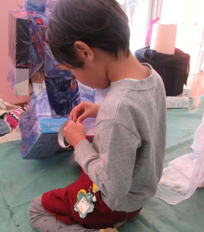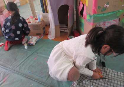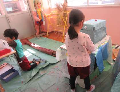 かいたりつくったりすることを毎日楽しみ、『こどもてんらんかい』に期待をもつ姿が見られます。「もうちょっとで、完成するねん」「お家の壁にきれいな布を貼りたい」「ここを立つようにしたら、できあがり!」と自分なりのイメージしたものをつくりあげる嬉しさを味わっています。