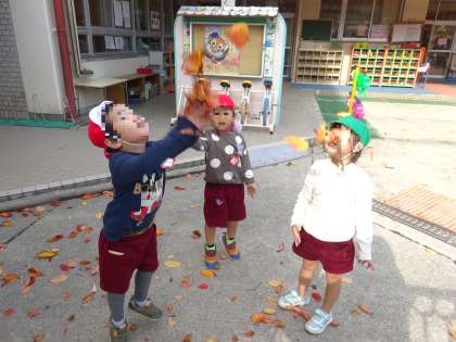 今日は、休み明けだったので、たくさん落ち葉がありました。集めて空に向かって投げてみると…「わー!葉っぱが落ちてきたよ」と、落ち葉が舞い上がったことが面白かったようです。何度も何度も繰り返し楽しんでいました。今しかできない遊びですね。また、みんなで落ち葉で遊ぼうね。
