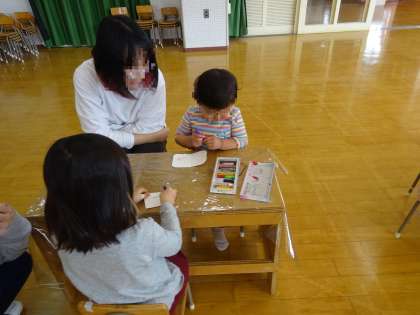 今日は、12月のいちごクラブがありました。園庭で遊んだ後は、遊戯室でカスタネットをつくって遊びました。牛乳パックにクレパスで絵をかき、ペットボトルのキャップをつけると…『カチ、カチ、カチ』と、素敵な音が鳴りました。最後は、みんなで『あわてんぼうのサンタクロース』に合わせて、楽器遊びをしましたよ。楽しかったですね。