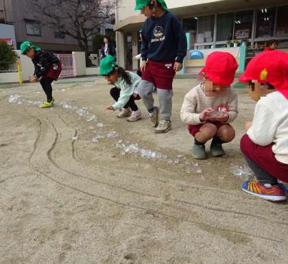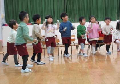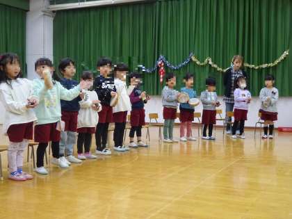 今日は、待ちに待った『おたのしみかい』でした。「サンタさん来てるかな〜」と、ドキドキしていた子どもたち。遊戯室で、楽しく遊んでいると、「シャンシャンシャンシャン」と、鈴の音が聴こえ、サンタさんが来てくれました!各クラスで考えた質問をしたり、サンタさんから一人ずつプレゼントをもらったりし、にこにこ顔がいっぱいでした。最後は、みんなで、サンタさんに感謝の気持ちを込めて『あわてんぼうのサンタクロース』を歌いました。また、園庭に出ると、氷やソリの跡があり、「すごーい!」と、大興奮です。とっても楽しい、おたのしみかいでしたね。