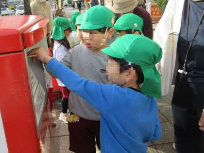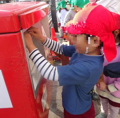 今日は、自分で絵をかいた年賀状をポストに入れに行きました。ポストに入れることが初めての子どもたちもおり、ワクワクした様子でしたよ。1月1日に届くのが楽しみですね。