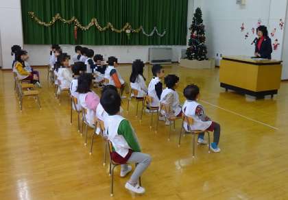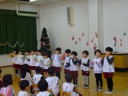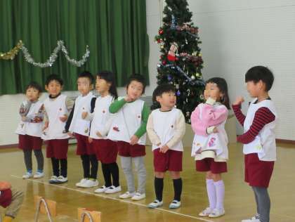 今日は2学期終業式でした。園長先生のお話のあと、各クラスの歌を発表しました。4歳児ばら組は、『ヤッター!サンタがやってくる』の曲に合わせて自分たちで考えた振り付けをしながら歌いました。5歳児まつ組は、『あいさつのうた』を手話に合わせて発表しました。最後は、お家の人、ばら組も一緒に手話をしましたよ。3学期も元気に幼稚園に来てくださいね。