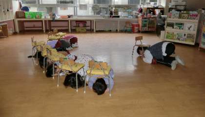 幼稚園では、緊急地震速報を聞き、頭をかくしてダンゴムシのポーズで体を守ることができました。