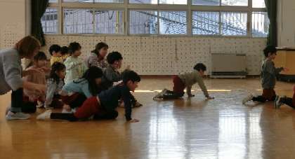 「わんぱくだんごっこ」のお話で、イメージをふくらませて表現遊びを楽しんでいます。