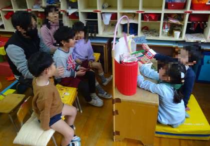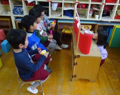 「映画が始まりますよ〜」と、友達に声をかけ、映画ごっこをしていました。手作りのペープサートを使い、お話も自分たちで考えて遊んでいました。「もっとお客さん来てほしい!」と、養護教諭、事業担当主事さんを招待し、映画ごっこを見てもらいましたよ。たくさんのお客さんに見てもらえて大喜びでした。