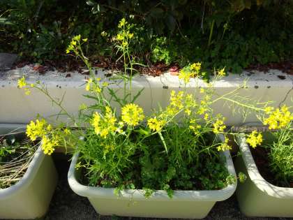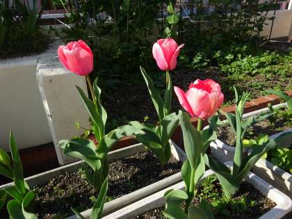 1枚目:チューリップ、2枚目:ブロッコリーの花、3枚目:水菜の花