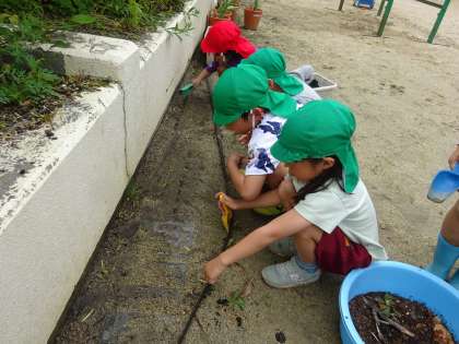 昨晩から雨が降り、園庭には水たまりがありました。午後からは水たまりもなくなり、外で遊ぶことができましたね。大好きなお外遊びに子どもたちも大喜びです!サッカーをしたり、ダンゴムシ探しをしたり…まつ組、ばら組で一緒にケンケンパをつくって遊んでいましたよ。明日はいいお天気になるかな?また、幼稚園でいっぱい遊びましょうね。