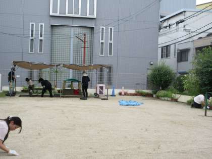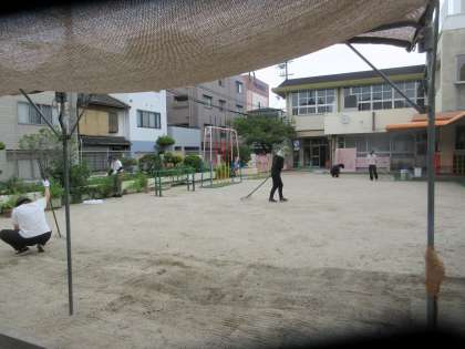 砂場の砂をスコップで掘り返したり、園庭の端から端までレーキをかけ、危ないものや大きな石が落ちていないかよく見て取り除いたり…。