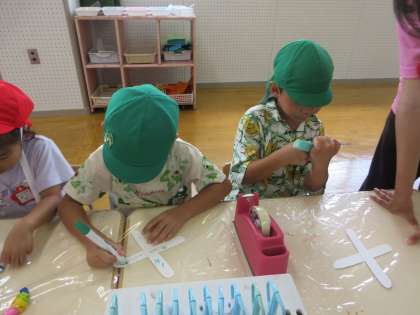 まつ組(5歳児)は何回も試しながら「全然飛ばない」「高く飛んだ」「戻ってきた」…。
