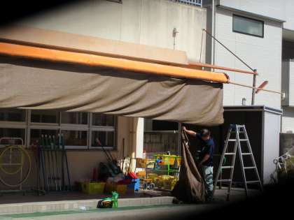 子どもたちが、涼しい所で座って休憩できるように、管理作業員さんが、日よけを増やしてくれました。
