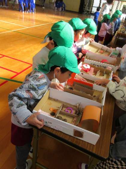 「浜寺公園で集めたよ」と、木の葉や枝、木の実を生かした7つの遊びをさせてもらいましたよ。
