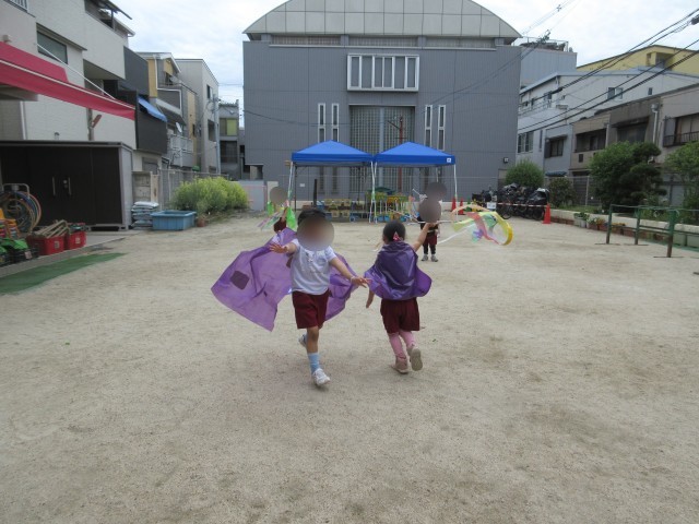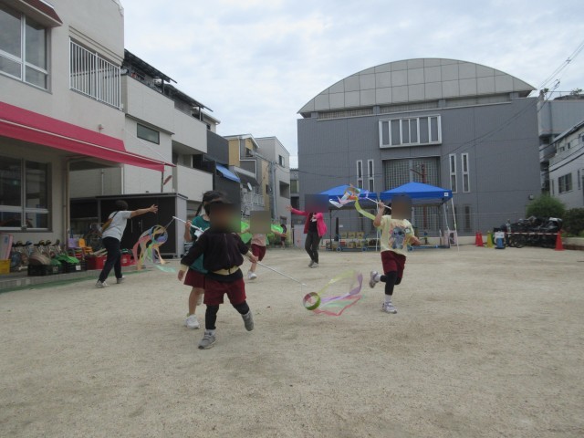まつ組のみんながそれぞれつくった吹き流しを持って園庭で走ると…。風になびいてとっても綺麗!