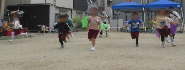 大きいこいのぼりになった先生たちと追いかけっこをしたり、みんなで一緒にかけっこをしたり、