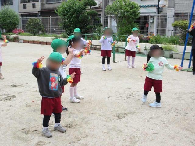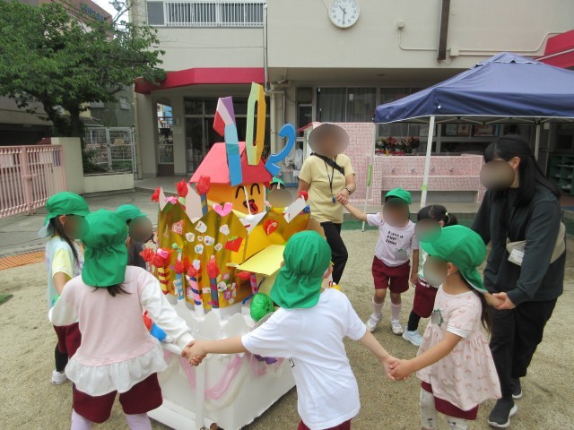 どうやって幼稚園さんのお誕生日をお祝いしようかな…と考えて、得意な遊びを幼稚園さんに見せたり、ダンスを見せたり、最後にはみんなでつくった大きな冠をプレゼントしたりしました。