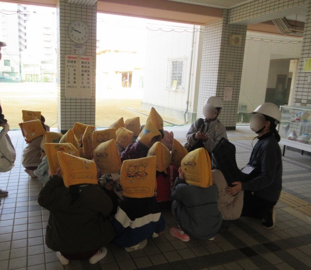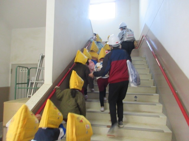 また、防災頭巾を被り保育室から園庭へ、園庭から粉浜小学校の校庭へ、校庭から4階の図工室に安全に避難することができました。