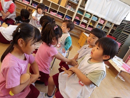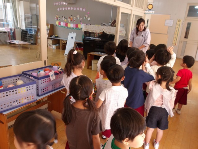 あお組が生活発表会で使っていた楽器をあか組の保育室近くに持っていくと、あか組は喜...
