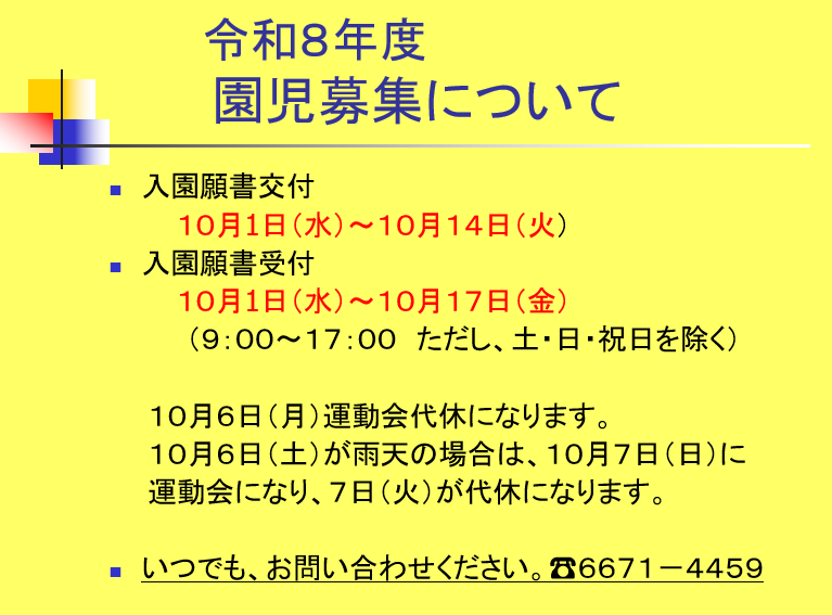 10月1日より入園募集が始まります。気になることがありましたら、幼稚園にお問い合わせください。見学も随時受け付けています。