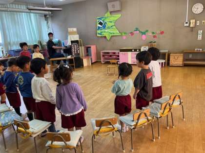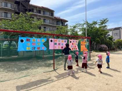 いい天気で、こどもの日の集い日和です。子どもたちは自分たちの作った鯉のぼりを見たり、歌を歌ったりして、楽しみにしていました。