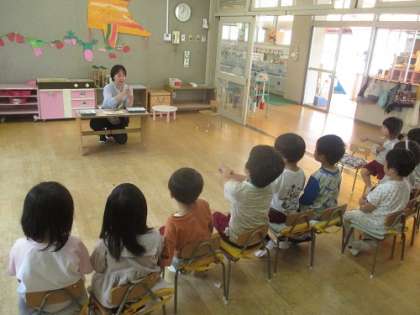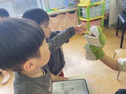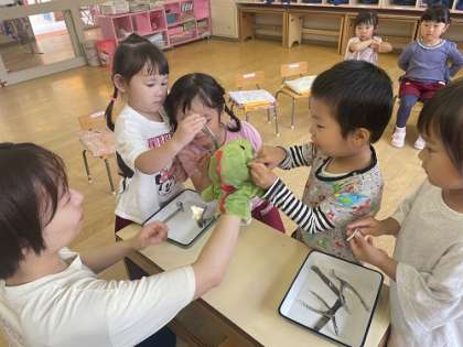 明日の耳鼻科検診に向け、それぞれのクラスで耳鼻科検診の事前指導を行いました。器具をどうやって使うのかお話しし、実際にお医者さんになりきって、患者さん役の恐竜のぬいぐるみに使ってみました。「明日は、みんなは患者さんをするんだよ」と話すと、「全然こわくない!」「できる!」と意気込んでいました。