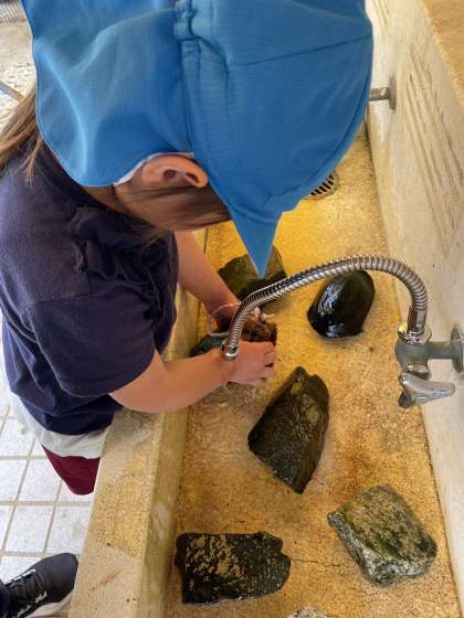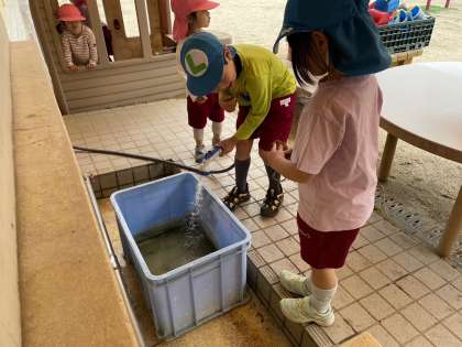 当番活動でカメの世話をしました。そっと優しくカメを持ち、石や容器を洗うときには力強くたわしでこすっていました。えさをあげて、カメが食べる様子を「口が動いてる」「お腹空いてたんかな」と、不思議そうに見ていました。