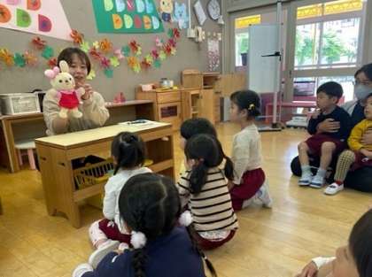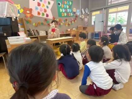 もも組に保健指導を行いました。けがをした時に放っておくと、傷口からばい菌が入ったり、痛みが続いたりしてしまうことをお話しました。「けがをしたら誰に言えばいい?」と聞くと、いつも絆創膏を貼ってくれる人を思い出して、「ママ!」「先生!」と言っていました。「けがをした時は、先生やおうちの人に言えるかな?」と聞くと、「できる!」と自信満々に答えてくれました。