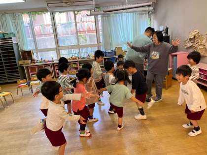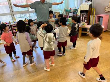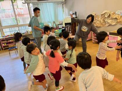 「こんなのできるかな?」と先生がやってみると「簡単」と真似っこを始めました。グラグラしながらも「すごい?」と嬉しそうにし、「もう一回」と何度も挑戦して遊びました。