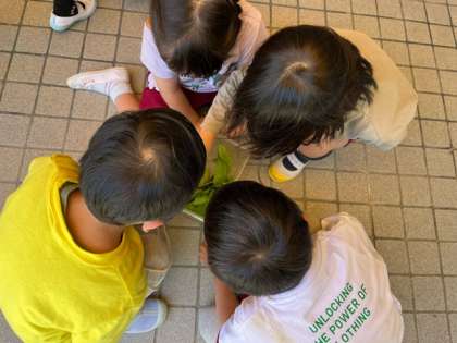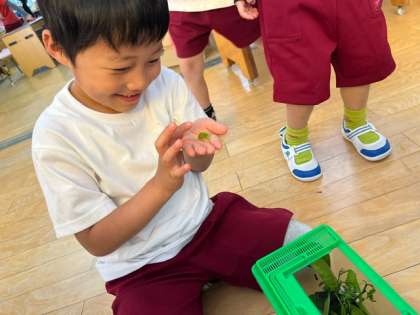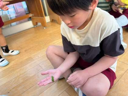 「黒い虫を見つけてきたのに、青くなったよ」「触って見てもいいかな」と、食後はみんなであおむしの観察をしています。