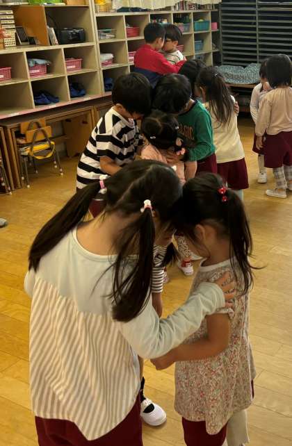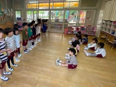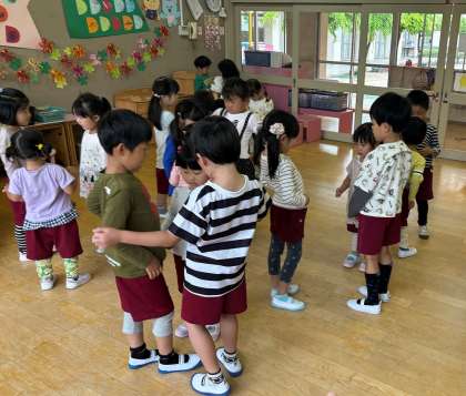♪ひっつきもっつき ひっつきもっつき あらあらくっついた〜歌の後に、体のいろいろな部分をくっつけます。あお組がもも組の子どもたちの背の高さに合わせて、上手にぴったんこ!してくれました。くっついたら、なんだか楽しくなって仲良くなる歌遊びです。
