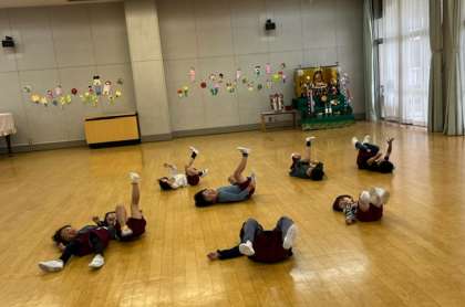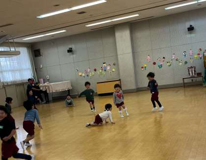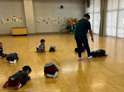みんなで大好きなダンゴムシになって遊びました。のそのそ歩くダンゴムシになっていたり、食べられないように丸くなったり、足をバタバタさせたり、なりきって遊びました。