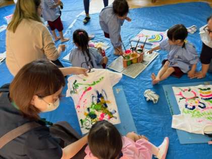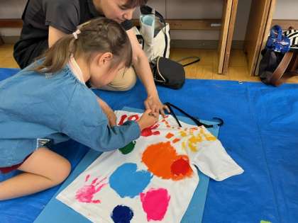 Tシャツがカラフルになっていき、素敵なTシャツになっていきました。記念に手形を押して、模様にしたり、好きな色を使ったりして、かわいいTシャツができました。
