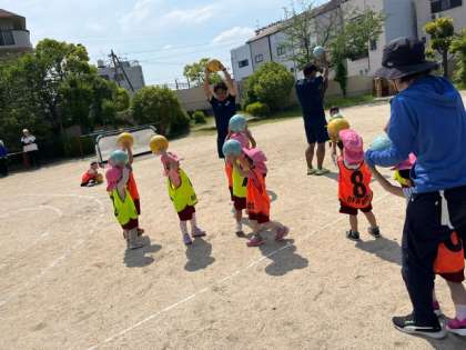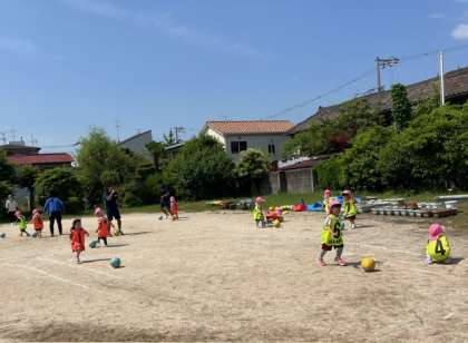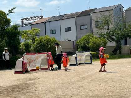 初めてのサッカー遊びでした。園庭でしましたが、みんなコーチの話を聞いて、楽しんでボールに触れて遊んでいました。しっかり蹴って、シュートもできていました。
