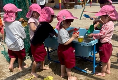 もも組が遊んでいた砂場近くに、水の入ったたらいを見つけ、手でチャプチャプ!