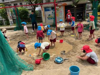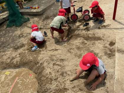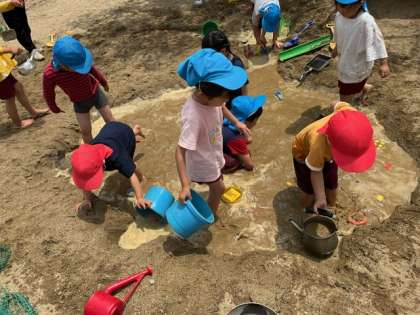 今日も天気がよくなり、砂場で道を掘っていましたが、水を流して遊び始めました。どんどん大きな穴に水を溜めて、足が深く入ることを楽しんでいました。