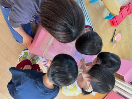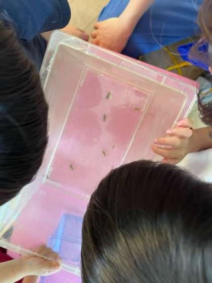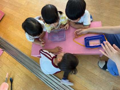 あお組がヤゴの話をしていたので、園長と事業担当主事さんで2階のプールを確かめると、プールにヤゴがいたので、すくって子どもたちに渡しました。あお組も見ていましたが、もも組が喜んで見てくれていました。
