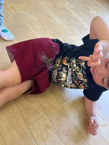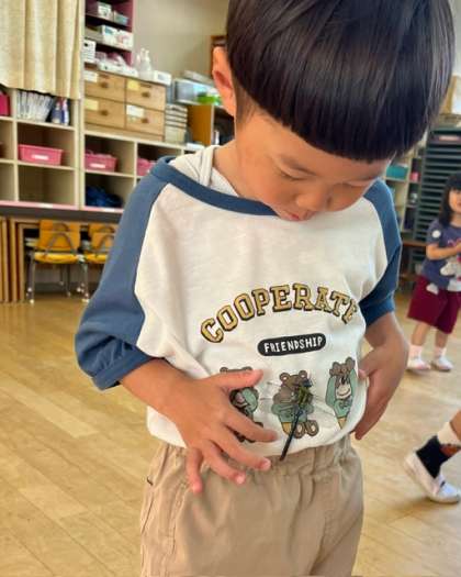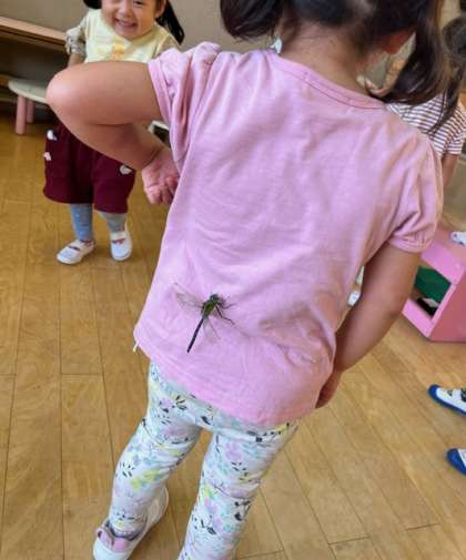 ヤゴを見ていたもも組でしたが、「これはなんの赤ちゃんかな?」「トンボさんかな」と言っていました。「あお組さんのトンボさん見せてもらおう」と、トンボを連れてきました。羽根が傷ついてほとんど飛べないトンボでした。子どもたちの服にとまり、少し怖がりながらも「かわいい」と見ていました。