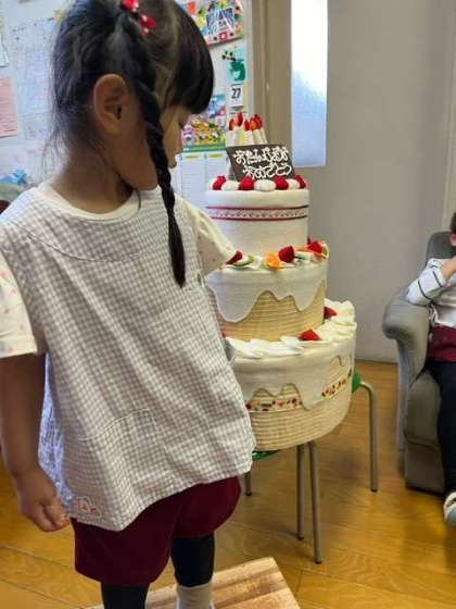 大きいケーキを背に、元気な声で、組や名前、誕生日や何歳になったか、頑張っていることや好きな食べ物を話していました。初めて誕生会の3歳児もしっかり言っていました。