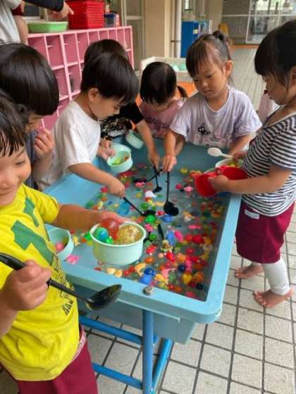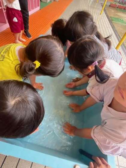 お水ちゃぷちゃぷ〜(もも組) 公開日 2024/05/28 更新日 2024/05/28 園の様子 今日は生憎の天気でしたが、もも組はテラスでお水遊びをしました。 新聞遊びで暑かったので、水の中に手を入れるだけでも「気持ちいい〜」と喜んでいました。 その後、スーパーボールや魚をすくって遊びました。キラキラボールや魚だけをねらってすくったり、カップいっぱいに入れたりして、楽しみました。 いいね(0)
